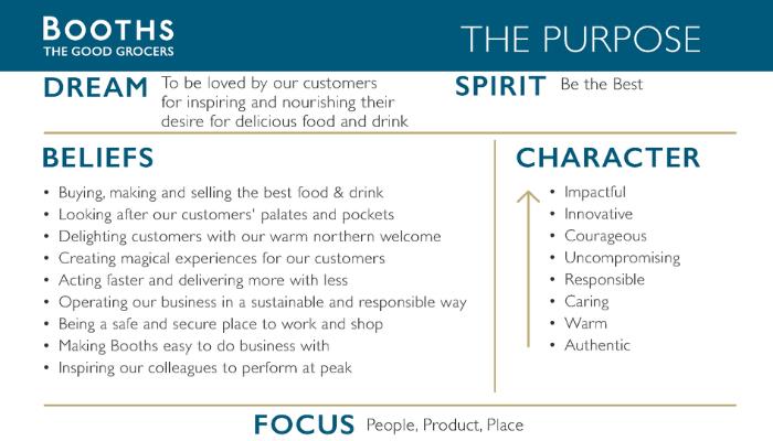 The ‘Purpose’ is our business vision on a page and gives direction to our colleagues who work at Booths. It starts with a big dream and encompasses the spirit and focus of the Booths brand. Having an aligned set of beliefs means that we are all moving in the same direction and defining the ‘character’ traits, all our colleagues identify what great behaviour looks like at Booths.